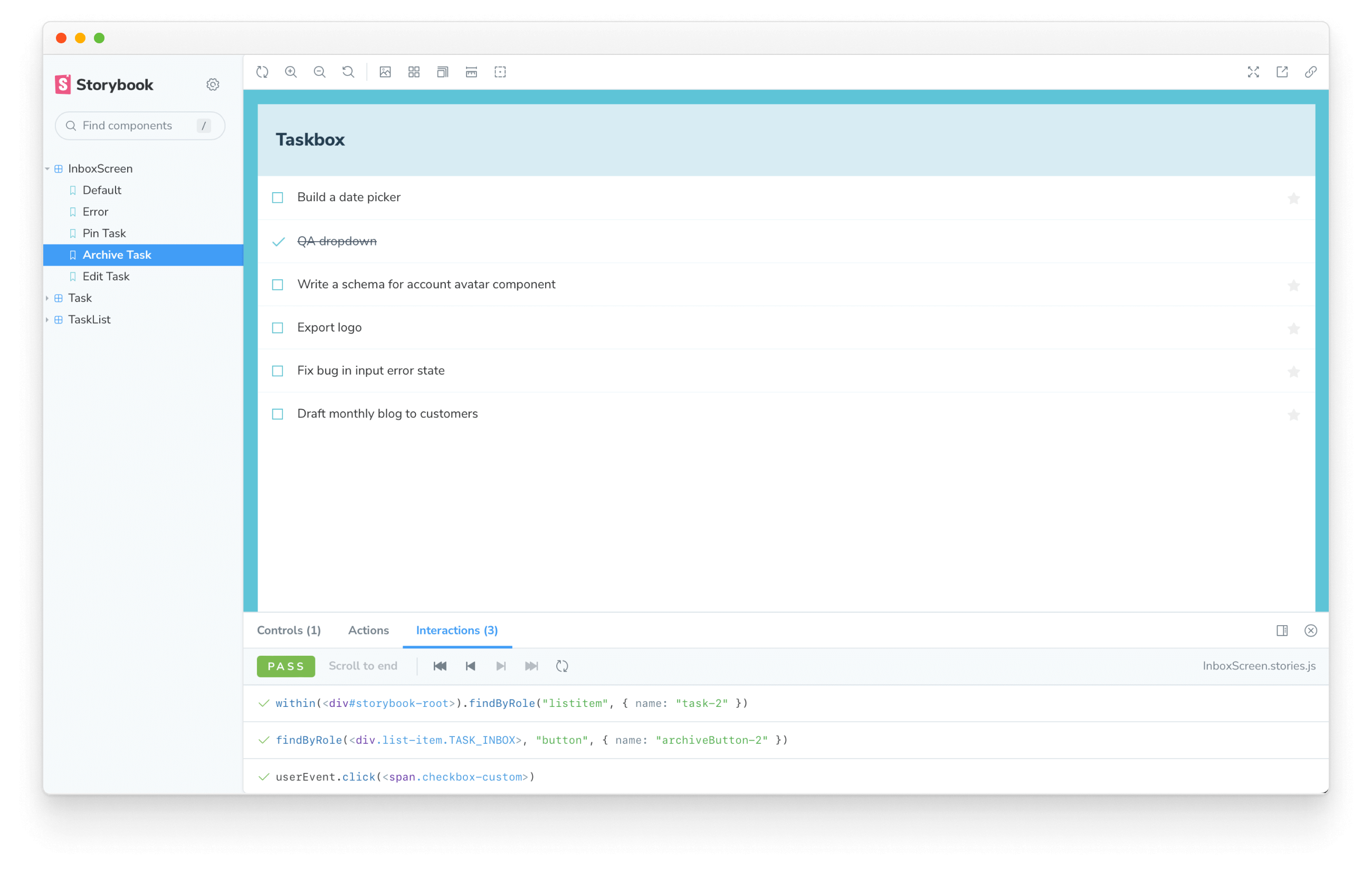 On the InboxScreen, the user can click on the star icon to pin a task. Or click on the checkbox to archive it. Visual tests ensure that the component looks right in all those states. We also need to ensure that the UI is responding to those interactions correctly.